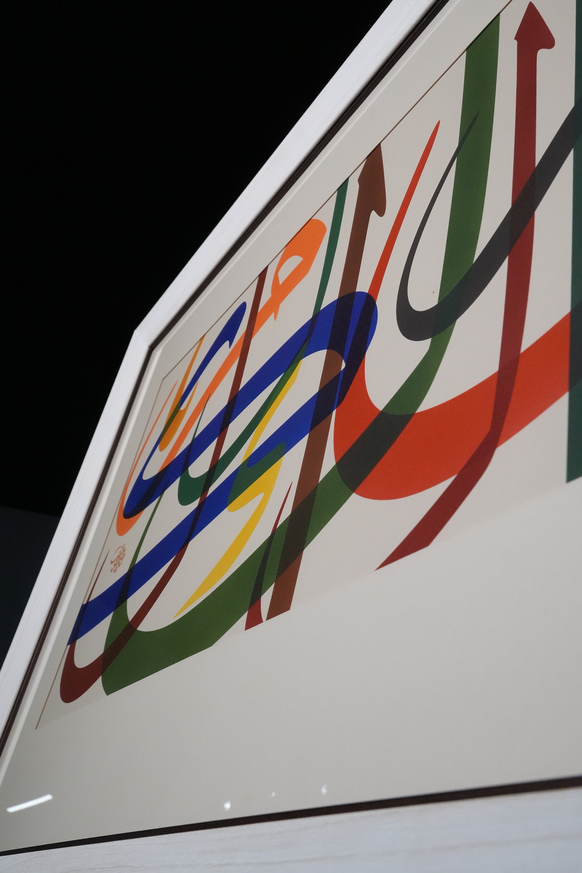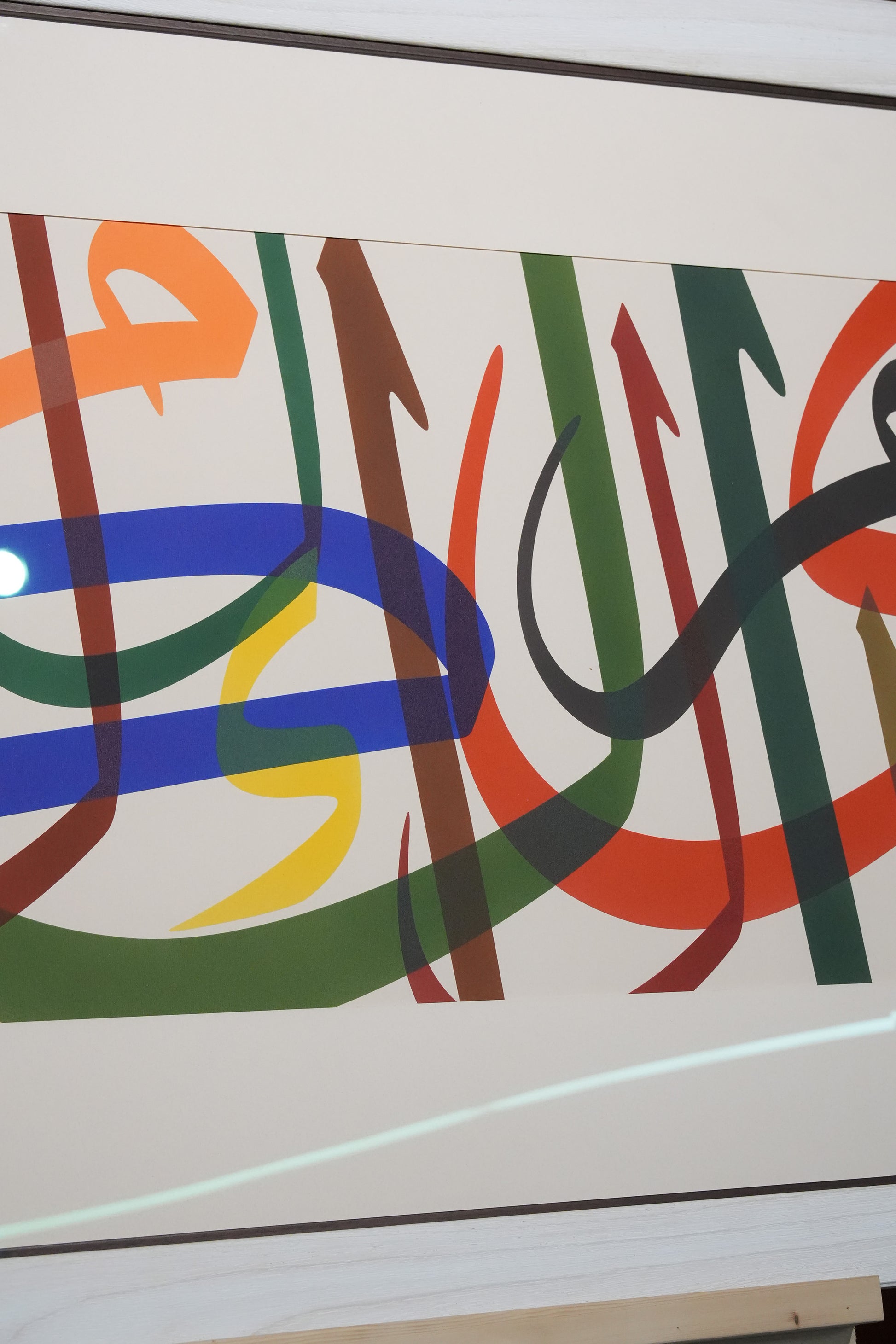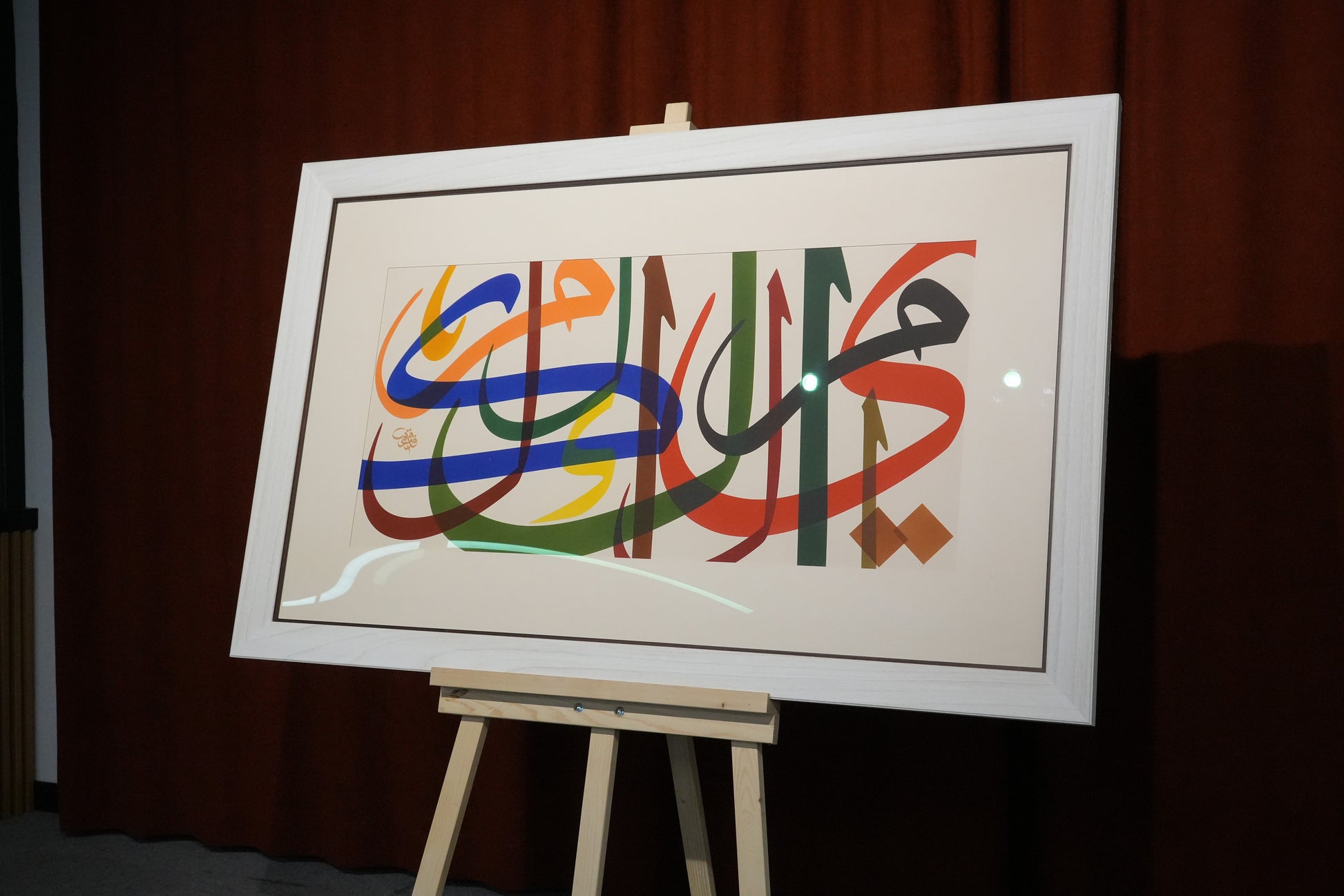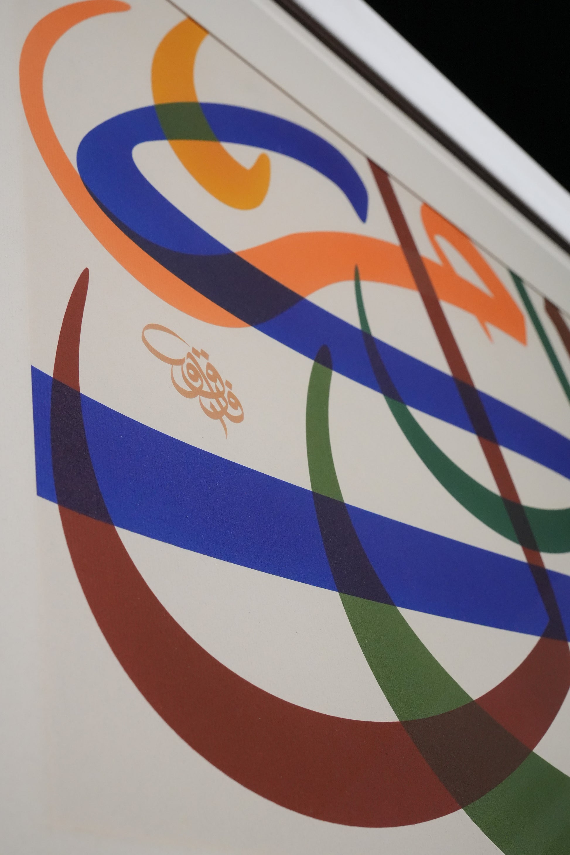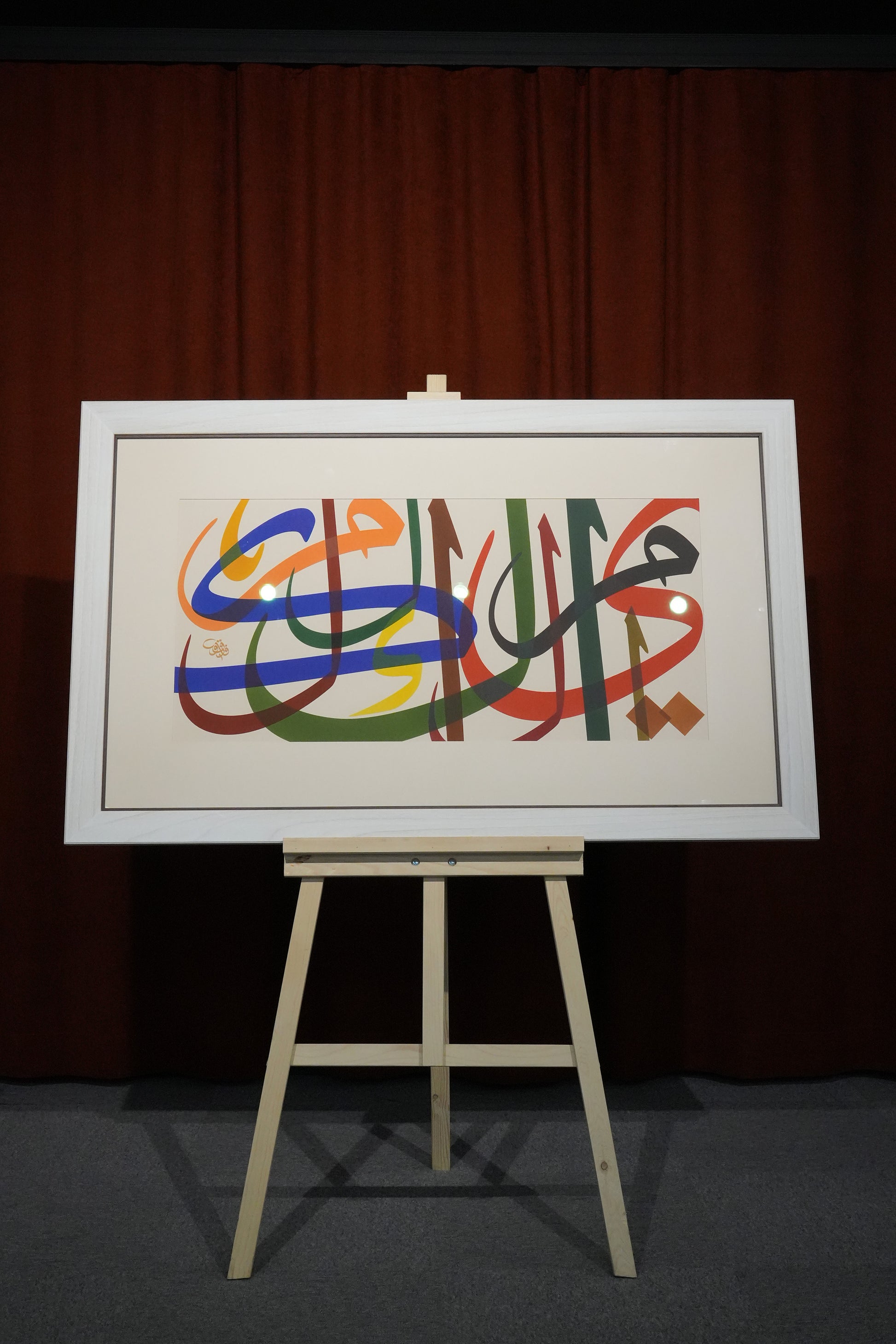 The composition, which presents a multi-colored integrity, basically emphasizes the principle of seeking unity in fraction. The letters, which are arranged in the order in which they are read from right to left, adhere to the rules of stacking, which are formed by fitting words into a certain space in the art of calligraphy. In the work, the principle of open composition is followed, and the viewer is left with the task of completing the sections that overflow out of the area through gold cutting. Thus, the focus transferred from the work to the viewer points outside the composition space. In this respect, the work can also be seen as a modern take on the form of scribbling in calligraphy.
